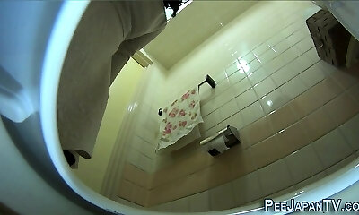 Ladies approach cunt and anus to working toilet cam